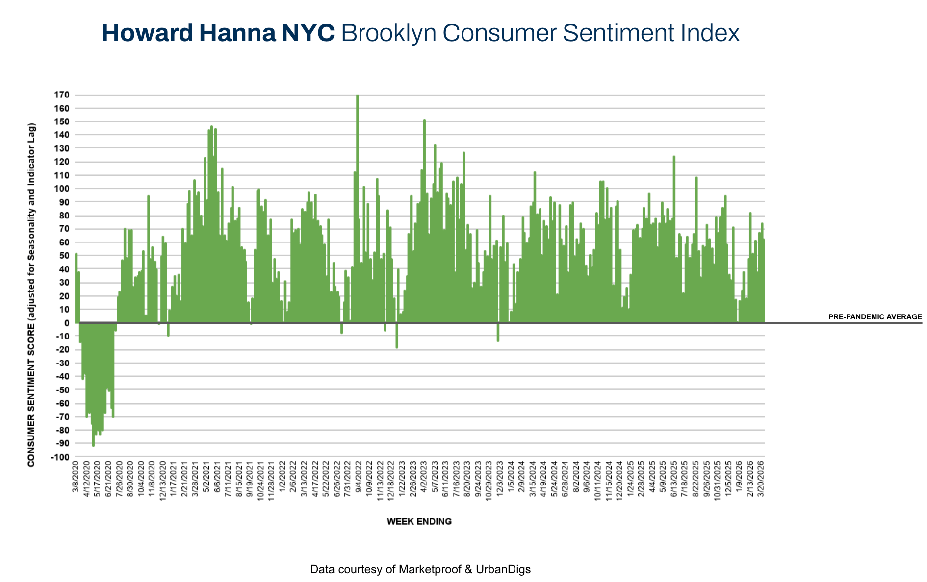 The Howard Hanna NYC Brooklyn Consumer Sentiment Index declined from +74% to +62%, though it remains at a high level, indicating sustained buyer engagement.