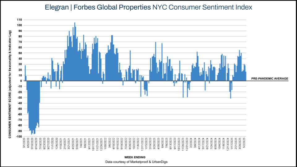 Manhattan saw 229 contracts signed this week — down 15% from last week, but still 5% above the same time last year. This weekly slowdown nudged the Elegran | Forbes Global Properties Manhattan Consumer Sentiment Index into negative territory, shifting from +13 to -7. It’s the first dip in sentiment after a multi-week positive streak, though underlying demand remains stronger than in 2024.
