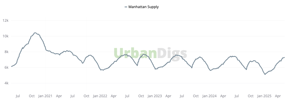 Manhattan’s active inventory climbed 1% to 7,332 listings this week, continuing its spring expansion. The standout? New listings jumped 17% week-over-week and were 13% above last year, outpacing typical seasonal trends. This unexpected late-season boost is giving buyers more choices as summer approaches.