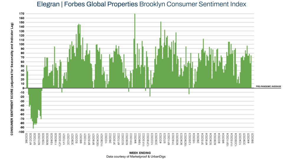 Brooklyn recorded 144 contracts this week, down 3% from last week and 1% below last year — a sign of steady demand. The Elegran | Forbes Global Properties Brooklyn Consumer Sentiment Index dipped slightly from +80 to +75, but remains firmly in positive territory. In a market defined by stability, Brooklyn continues to show resilience and buyer confidence.