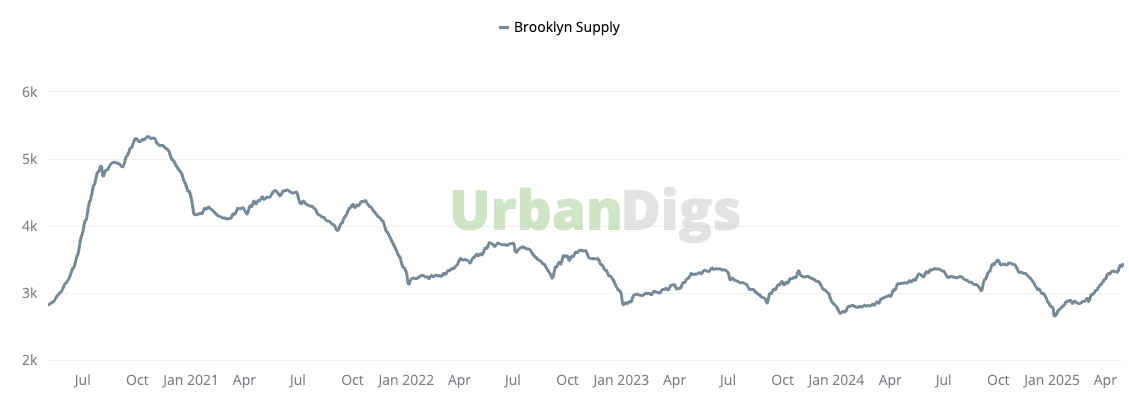 Brooklyn's inventory edged up by 1.4% this week to 3,455 active listings, as 280 new properties entered the market, marking the second-highest weekly new listing count this year and one of the highest in recent years. This represents a 1% increase in new listings from the previous week, placing current inventory at the upper end of Brooklyn's typical spring range.