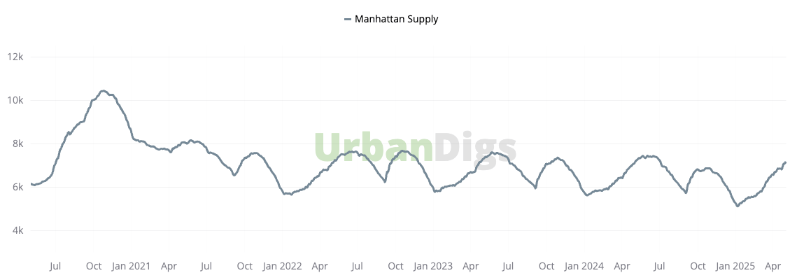 Manhattan's residential inventory increased to 7,193 active listings this week—a notable 2.4% climb. New listings were up 7% from last week and 6% higher than the same period last year. Spring inventory from March to early May has averaged 8% above last year's levels, indicating sustained seller confidence. This measured expansion is supporting healthy transaction volume without tipping market dynamics in favor of buyers.