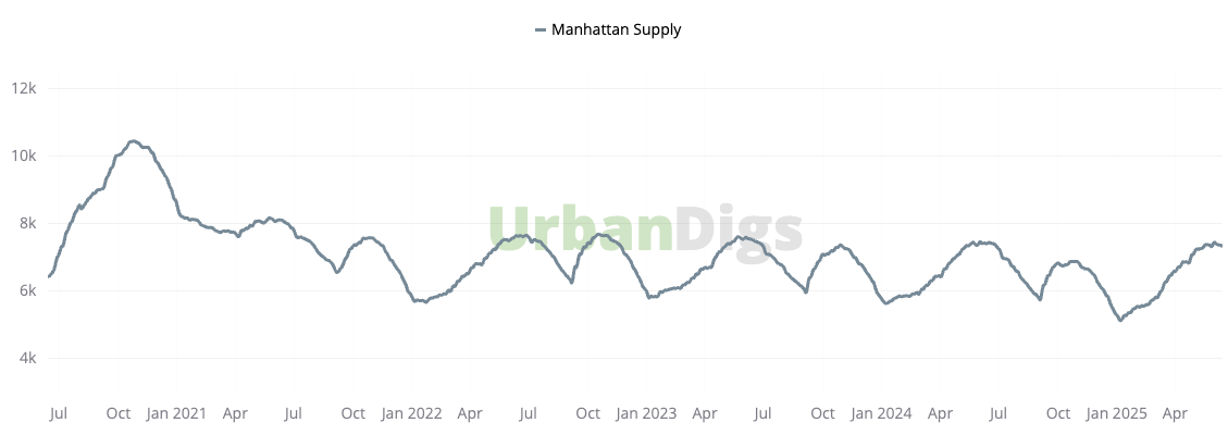 For the second week in a row, the number of homes for sale in Manhattan dropped—this time by 0.4%, bringing total inventory down to 7,327 active listings. That’s a clear signal: the spring wave of new listings is officially behind us.