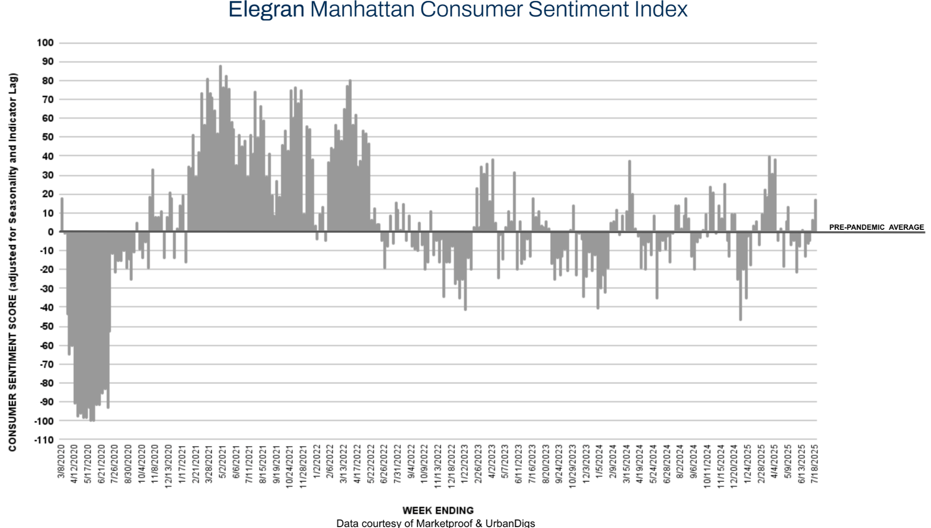 Despite softening pending sales, Manhattan contract activity rose to 212 signed contracts this week—a 12% gain from last week and 3% above the same time last year. As a result, the Elegran Manhattan Consumer Sentiment Index increased from +6 to +17. This rebound signals that while the broader market is in its summer lull, serious buyers are still transacting, particularly for well-located, competitively priced inventory.