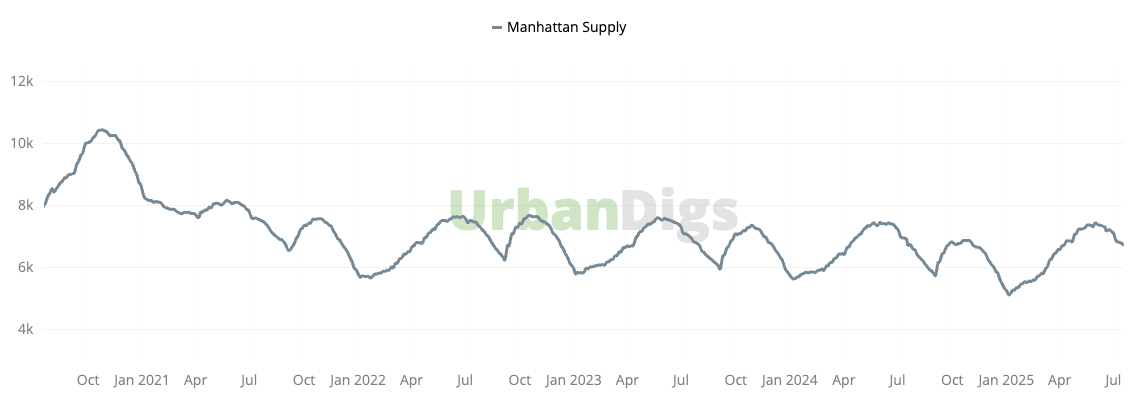 As we move deeper into July, Manhattan’s market continues its familiar seasonal deceleration: supply dropped for the seventh consecutive week, now sitting at 6,716 homes. While 283 new listings did come online (up 2% from the previous week), overall inventory still remains 2% lower than the same period last year. Pending sales dipped modestly by 0.6%, marking the third week in a row of decline, suggesting the peak buying season may be behind us.