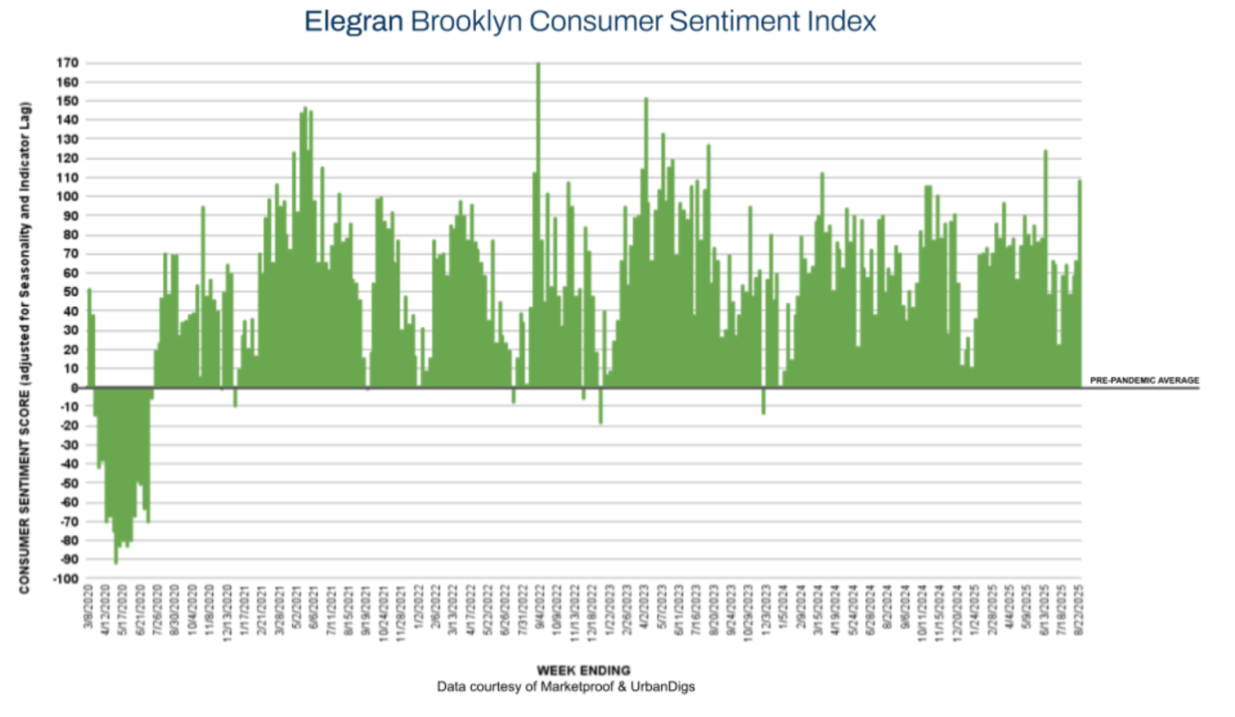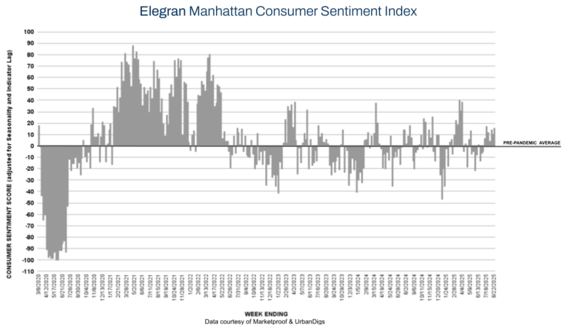 New York City’s residential market is showing renewed strength as summer winds down. This week, the Elegran NYC Consumer Sentiment Index jumped from 28% to 41%, signaling confidence levels well above pre-pandemic benchmarks. Manhattan remains steady with resilient contract activity despite tight supply, while Brooklyn recorded one of its strongest contract weeks of the year—outpacing seasonal expectations and signaling a powerful lead-in to the fall market.