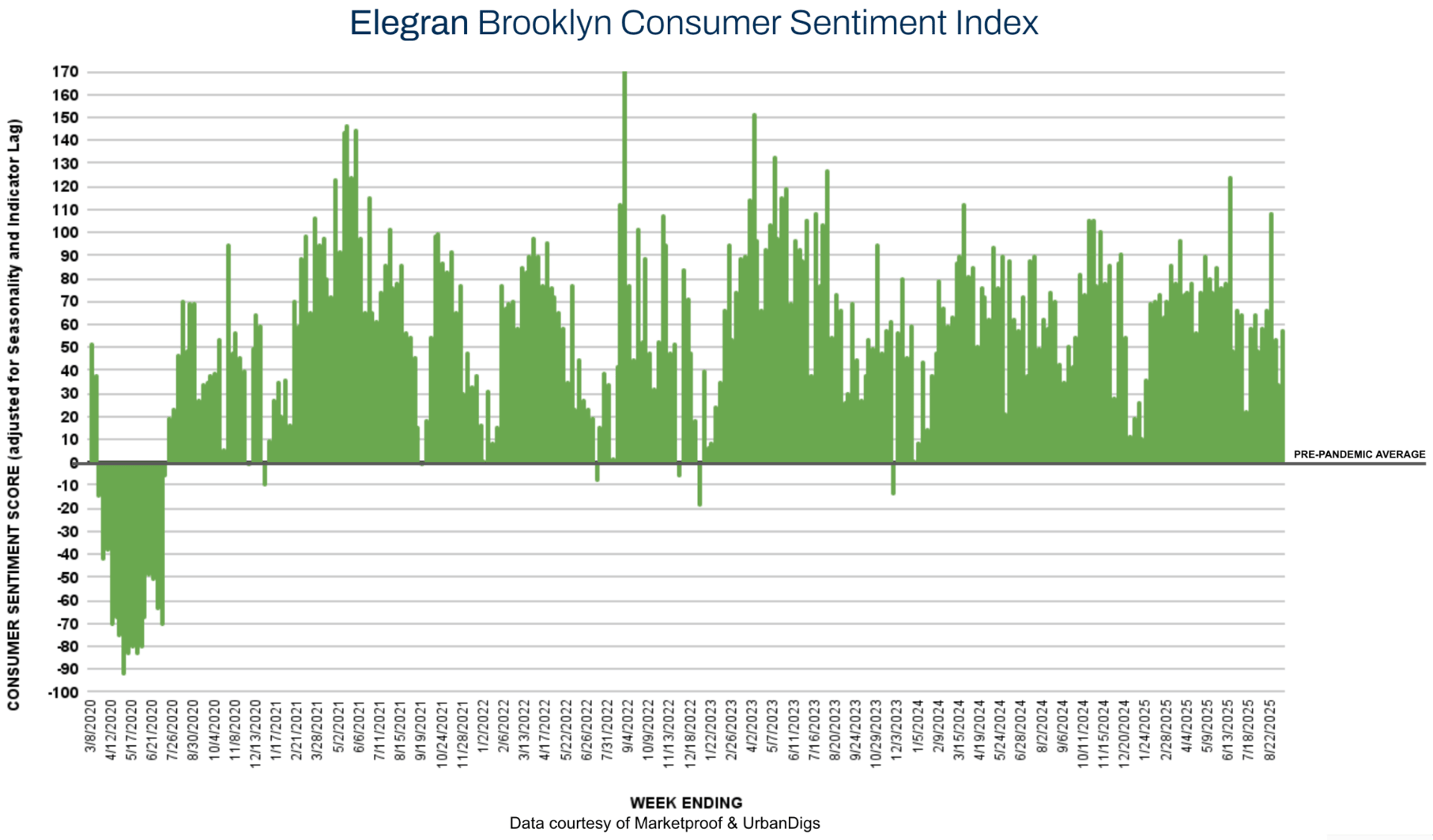 Brooklyn bucked the Manhattan trend, with 114 contracts signed (+21% WoW, +5% YoY). The Elegran Brooklyn Consumer Sentiment Index climbed from +34% to +57%, signaling strong buyer confidence. With new listings building momentum, Brooklyn’s market appears well-positioned heading into the fall.