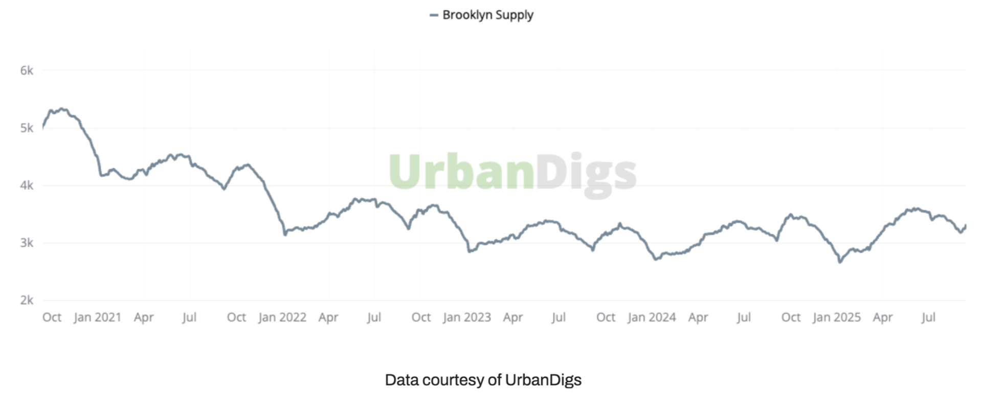 Brooklyn’s supply grew 3.7% to 3,333 homes. New listings totaled 259 units (+8.4% WoW, though ~7% below last year). Overall, supply is now 1.8% above 2024 levels, creating more opportunities for buyers while easing competitive pressure.