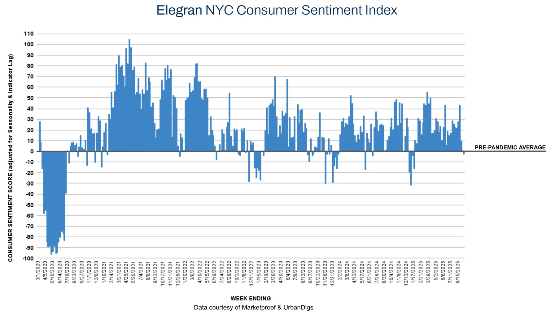 Manhattan contract activity slowed further, with 132 deals signed (–11% WoW, –20% YoY). The Elegran Manhattan Consumer Sentiment Index dropped from –15% to –22%, its third consecutive weekly decline. This dip reflects the usual early-September lull, though sentiment could rebound as buyers engage with fresh listings and potential interest rate adjustments.