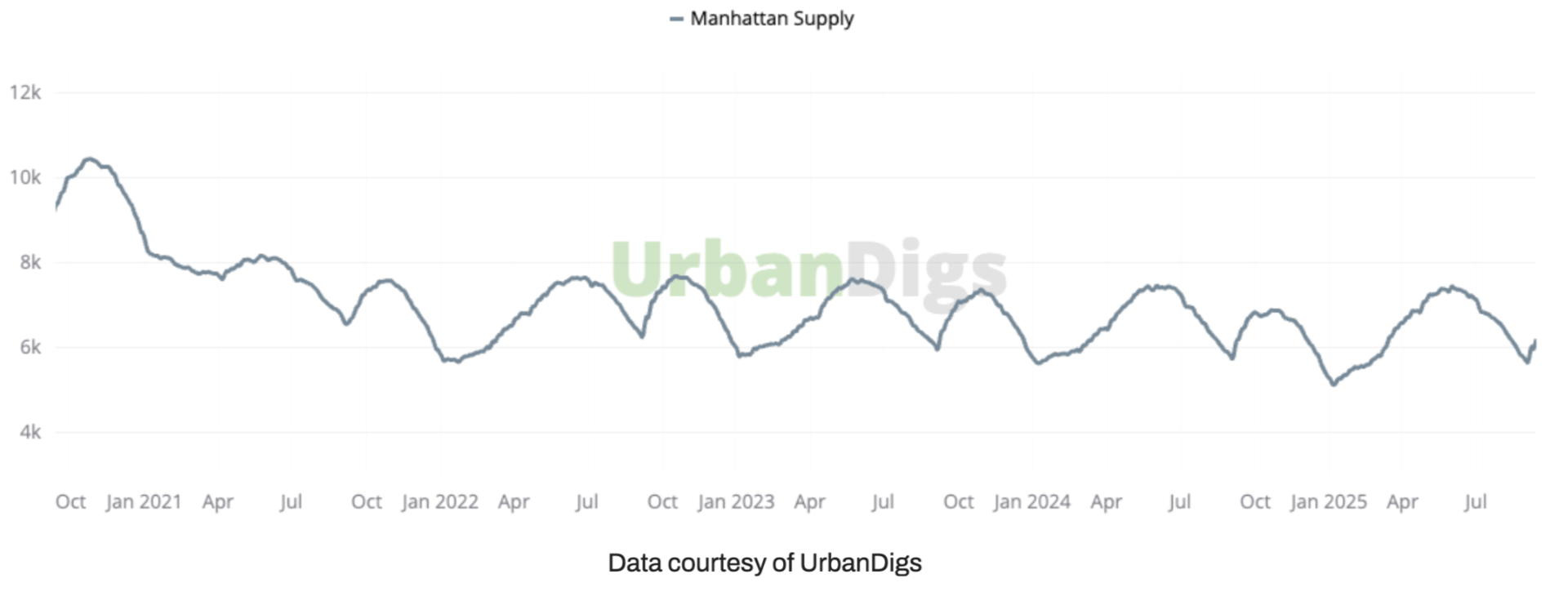 Manhattan’s inventory rose for the second straight week, climbing 5.1% to 6,210 homes. Sellers added 529 new listings, a 3% increase over last week and 9% higher than the same time last year. The seasonal post–Labor Day surge continues to rebuild supply after the summer slowdown.