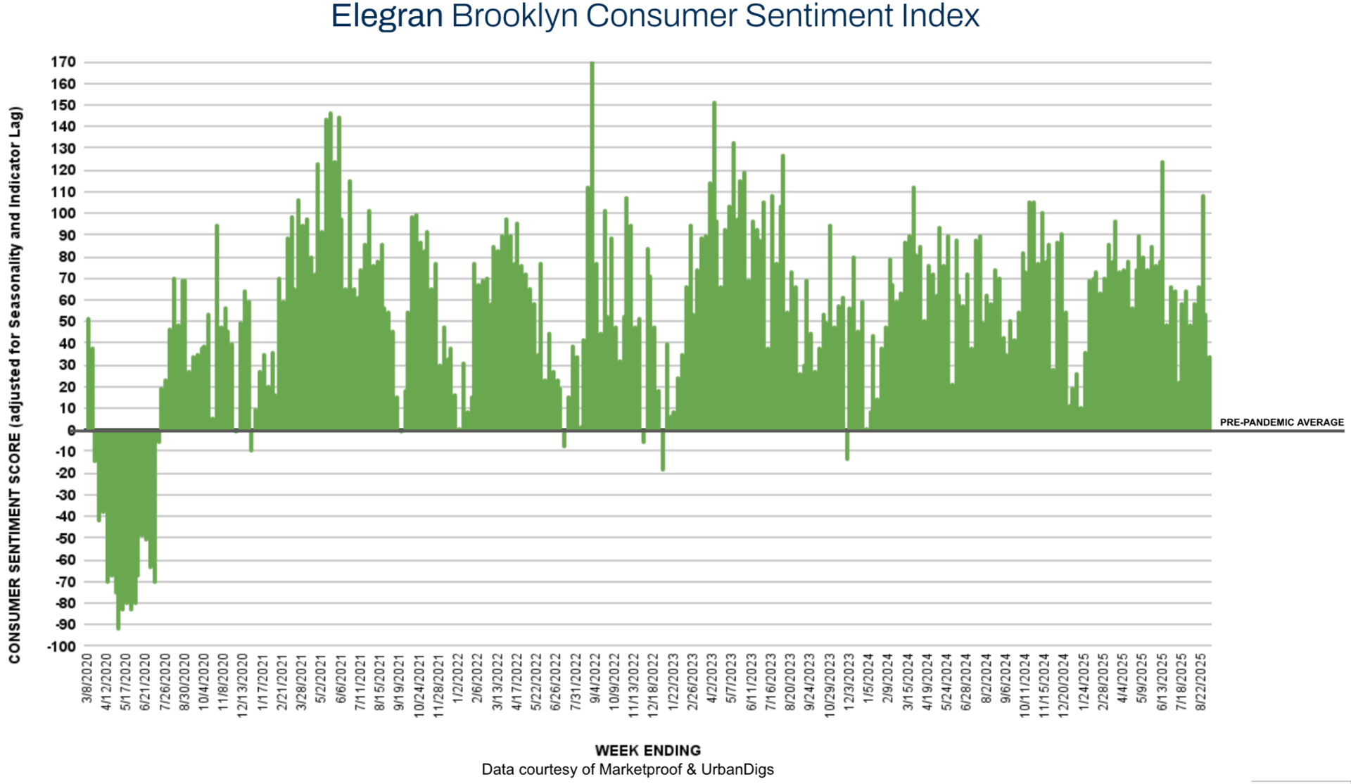 Brooklyn’s contract activity underperformed coming out of the holiday, with 96 contracts signed (–12.7% WoW). That total is only about 1% lower than the number of deals signed in the same week last year, indicating Brooklyn is essentially keeping pace with last year’s market. The Elegran Brooklyn Consumer Sentiment Index fell from +54% to +34%. While this is a sizable week-over-week drop, it isn’t out of the ordinary for the first week after Labor Day, given seasonal trends. Brooklyn’s sentiment index remains in positive territory, reflecting that buyers are still active and generally upbeat. With a significant increase in new listings now on the market, we anticipate that Brooklyn’s buyer engagement and sentiment could strengthen again as we move further into the fall selling season.