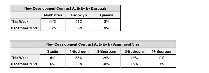 This week, 58 new development contracts were reported within 36 buildings. Manhattan’s new development contract activity continued to account for more than half of the volume within the three boroughs, while Brooklyn’s contract volume increased to 41% and Queen’s contract volume decreased to 16% compared to last week.