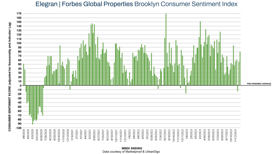 This week, Brooklyn’s score on the Elegran | Forbes Global Properties Brooklyn Consumer Sentiment Index jumped again from +57 to +80. 133 contracts were signed this week compared to 120 last week.