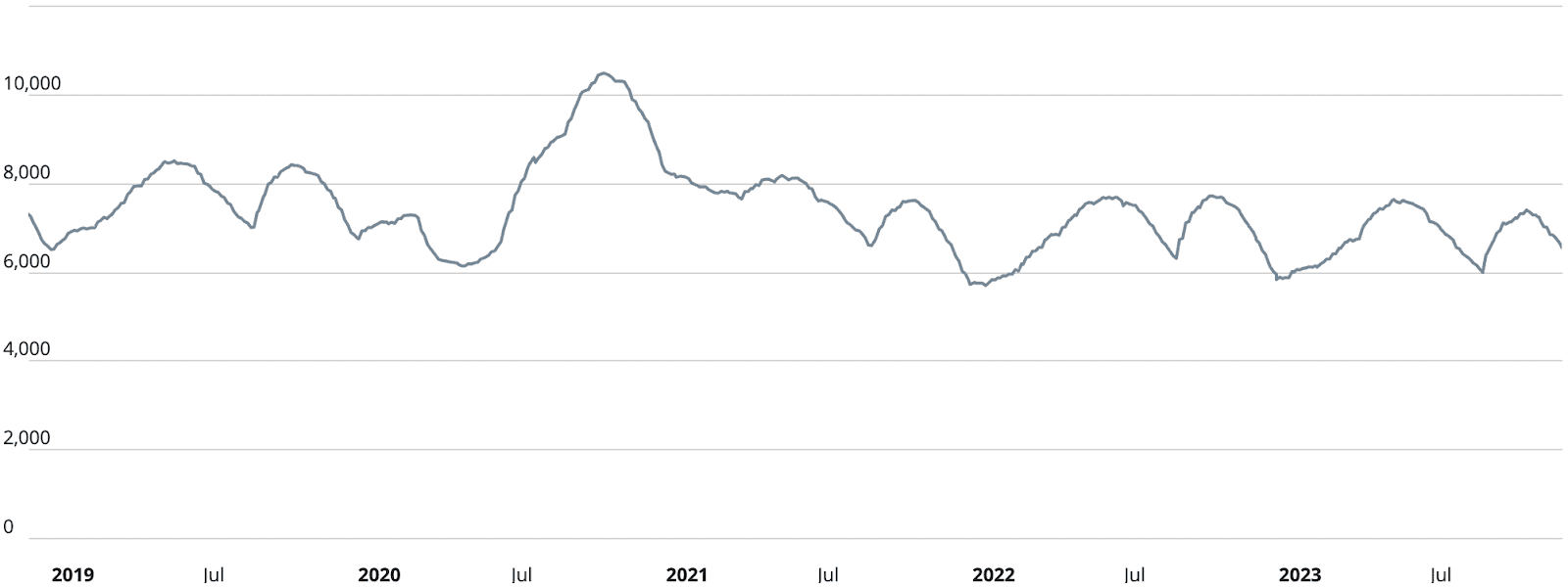 As we would expect, given the chart below, the metric is in decline and should continue to retreat for the remainder of 2023. The 3,149 units available are far more than are necessary to satisfy this week’s demand of 133 units.
