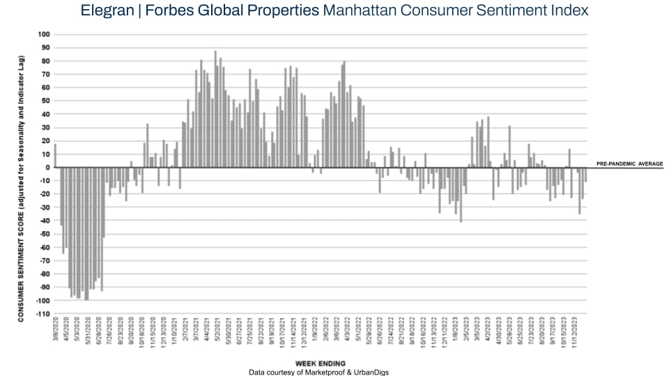 This week, the Elegran | Forbes Global Properties NYC Consumer Sentiment Index returned to positive territory. Measuring +12 this week, consumer sentiment has shown a notable recovery, increasing from last week's score of -3 and significantly up from the -31 score seen during Thanksgiving week.