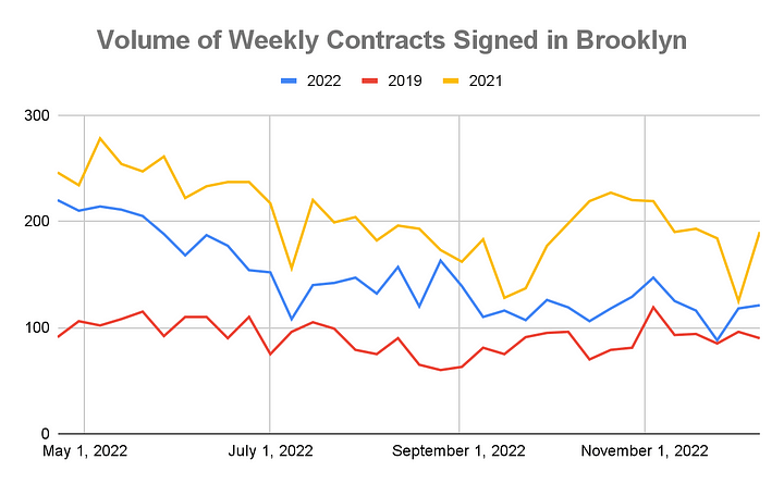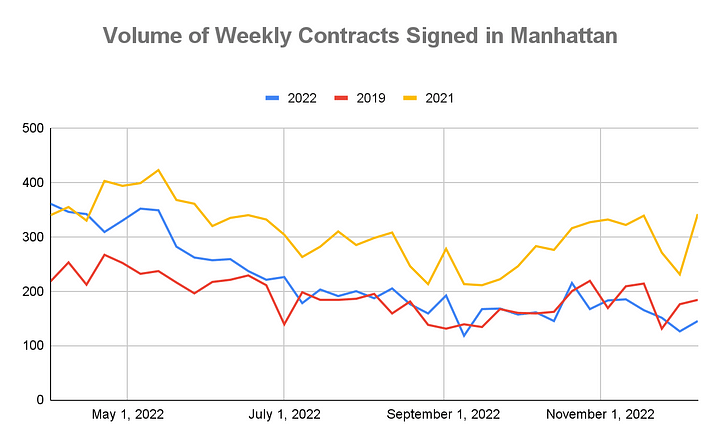 This week, 145 contracts were signed in Manhattan, an expected bounce-back following the Thanksgiving holiday slowdown, which typically extends into the following week.