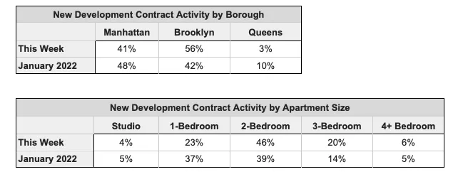 This week, 93 new development contracts were reported within 72 buildings, a 9% increase from the 85 new development contracts reported last week. Manhattan’s new development contract activity decreased to 41% this week, while Brooklyn’s increased to 56%, making up more than half of the contract volume within the three boroughs. Queen’s contract volume decreased to 3% compared to last week.