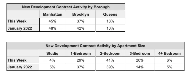 This week, 98 new development contracts were reported within 66 buildings. Manhattan’s contract volume increased to 45% this week, Brooklyn’s decreased to 37%, and Queens made up 18% of the contract volume this week.