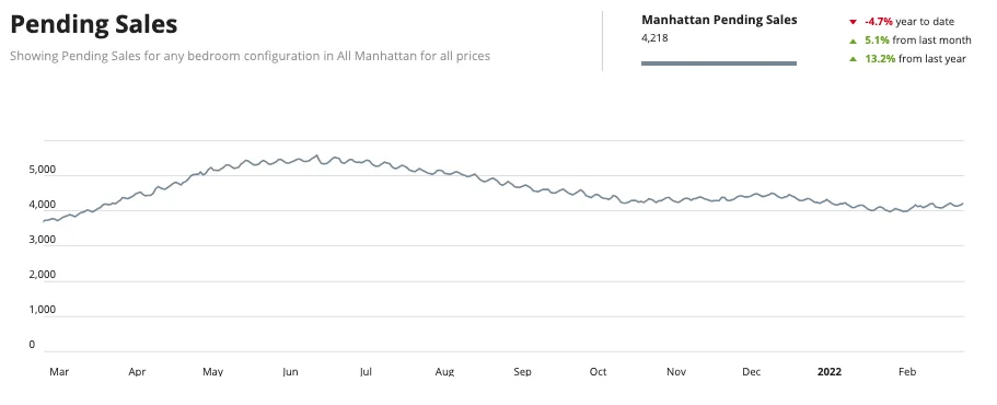 Spring has sprung! This week overall supply, pending sales, and contract volume rose in Manhattan and Brooklyn. In the last week, Manhattan supply rose 5% and Brooklyn supply rose 3%, as 536 new listings came to market in Manhattan and 281 in Brooklyn. More listings came to market this week in Manhattan than in any week in the last 6-months. Buyers are moving quickly with 336 contracts signed in Manhattan and 226 in Brooklyn. Manhattan’s Market Pulse decreased slightly from 0.8 to 0.76 while Brooklyn’s increased from 1.37 to 1.38 in the last week.