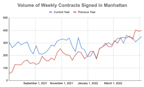 352 contracts were signed this week, the tenth week in a row that more than 300 contracts were signed. This represents a 7% increase from last week and a 12% decrease from the same week last year. This is the third week in a row where this year’s contract activity fell below the volume of the same week last year.