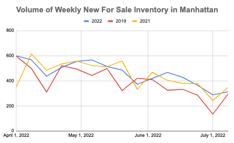 Last week, on the back of the July 4th holiday weekend, the slowdown in Manhattan and Brooklyn real estate was palpable. Both boroughs experienced their lowest weekly volume of contracts signed in well over a year and the number of listings declined in both boroughs by nearly 6% as new-to-market supply declined and more sellers’ took their homes off the market.
