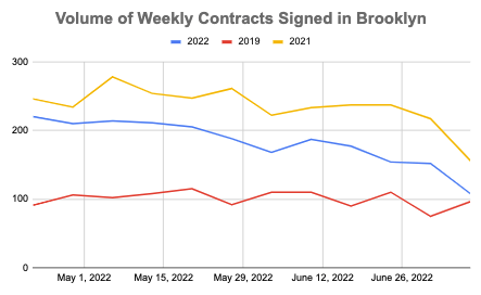 108 contracts were signed this week. This represents a 29% decrease from last week and a 13% increase from the same week in 2019. This week had the fewest contracts signed in Brooklyn in well over a year.
