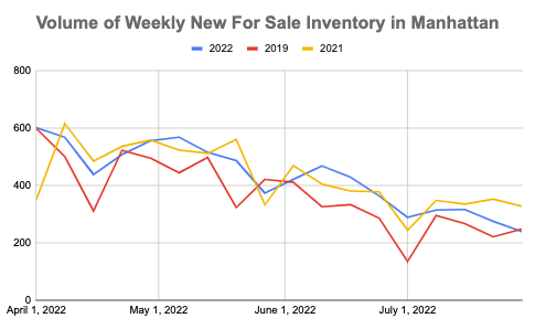Last week 238 new listings came to market in Manhattan, a decrease of 13% compared to last week and 4% less than the same week in 2019. This is the fewest number of new-to-market listings in a week so far this year.