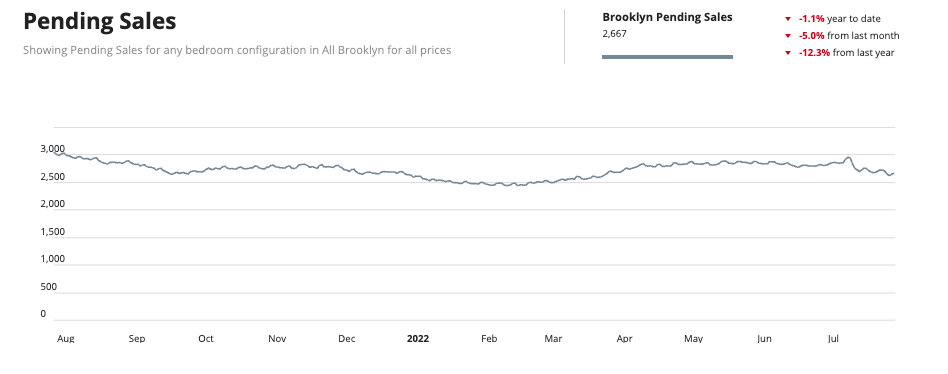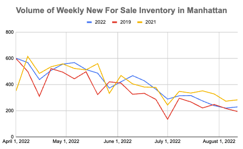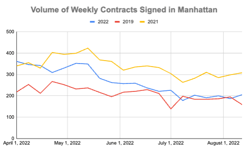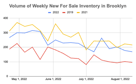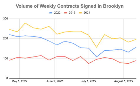 Contact activity in Manhattan and Brooklyn picked up last week, with Manhattan inking more than 200 contracts for the first time in four weeks and Brooklyn notching the most contracts signed in eight weeks. Buyers continue to face a dwindling level of listings, as overall supply ticks down amidst rising contract activity, more apartments being taken off the market, and fewer new-to-market properties (which is seasonally normal for August). Manhattan's supply is now below 7,000 units for sale for the first time in late April and Brooklyn’s overall supply is at the lowest level since late March.