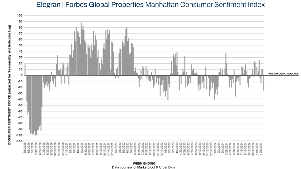 Despite the seasonal pause, demand was comparatively strong. Manhattan and Brooklyn saw year-over-year increases in signed contracts of 27% and 10%, respectively—highlighting continued buyer interest even during the holidays. This showcases the market’s resilience and steady performance heading into winter, with buyers seizing opportunities despite the limited inventory. The Elegran | Forbes Global Properties Consumer Sentiment Index dropped from +21 to -24, a shift attributed to holiday patterns rather than a fundamental market change.