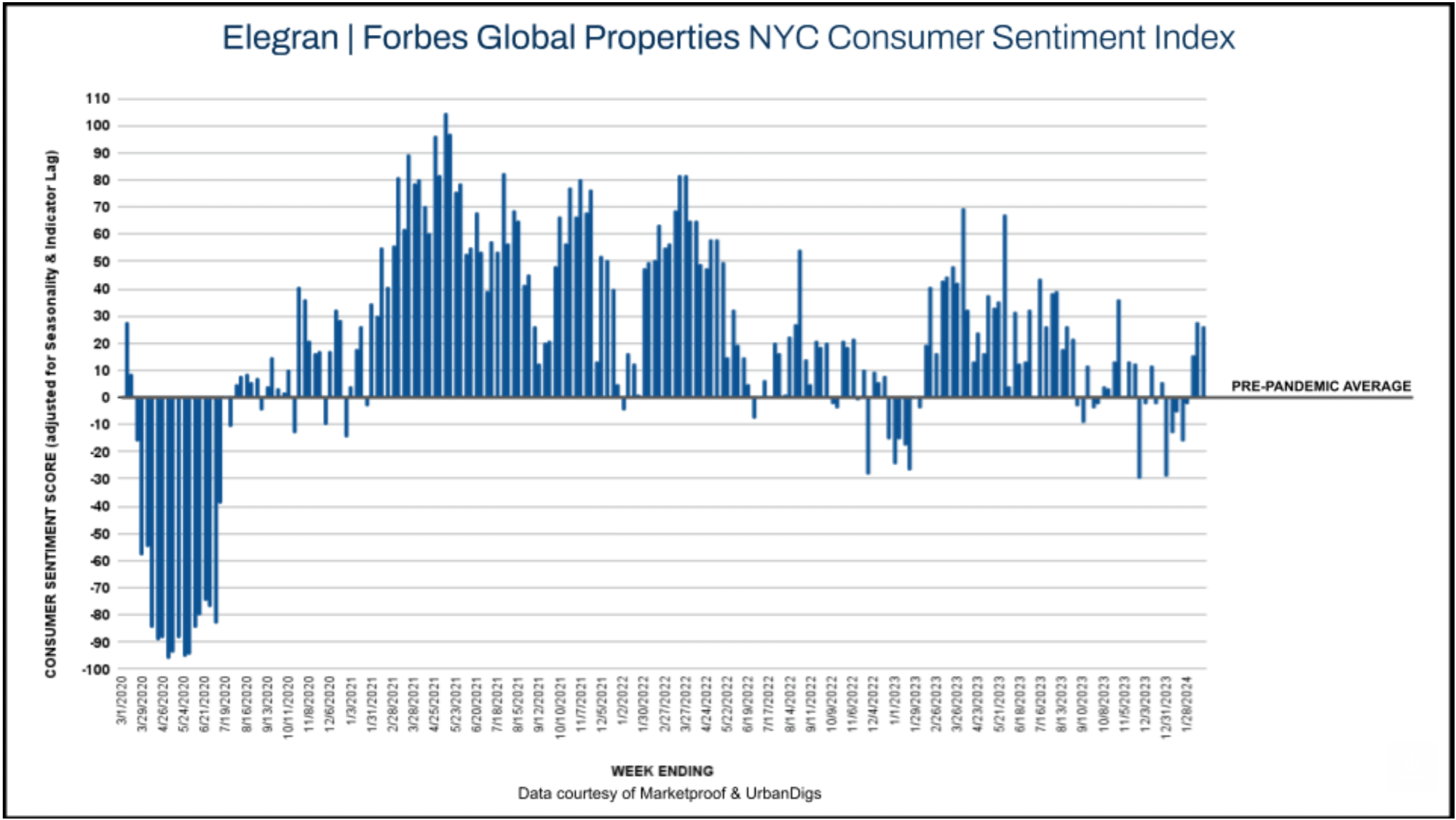 As Manhattan's real estate market sustains three consecutive weeks of robust demand, the Elegran | Forbes Global Properties NYC Consumer Sentiment Index held steady at +27, indicating a 27% increase in current consumer sentiment compared to the pre-pandemic average (from January 5, 2015, to February 29, 2020).