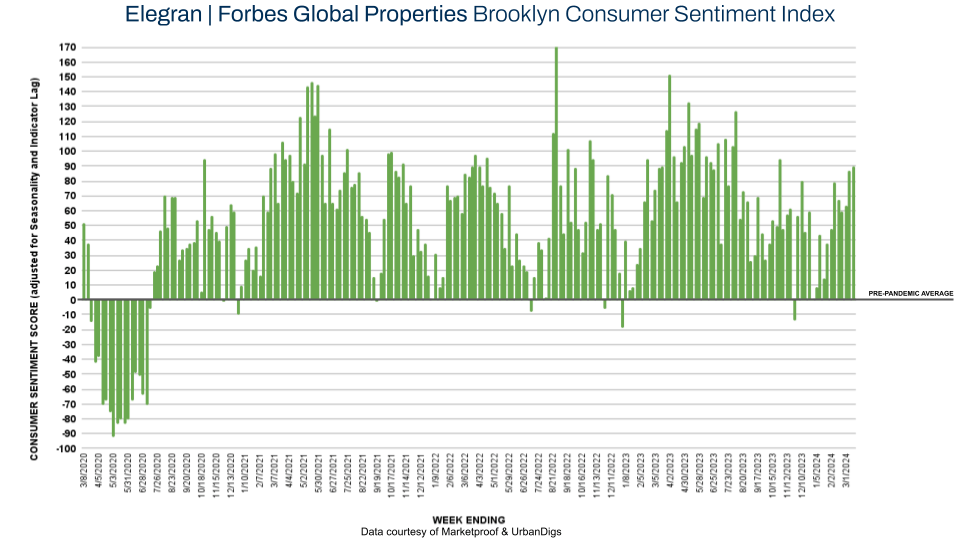 This week, Brooklyn’s score on the Elegran | Forbes Global Properties Brooklyn Consumer Sentiment Index increased from +87 to +90, as 141 contracts were signed this week, a slight increase from the 139 signed last week.