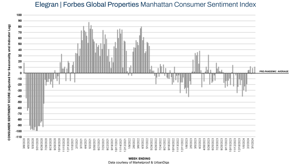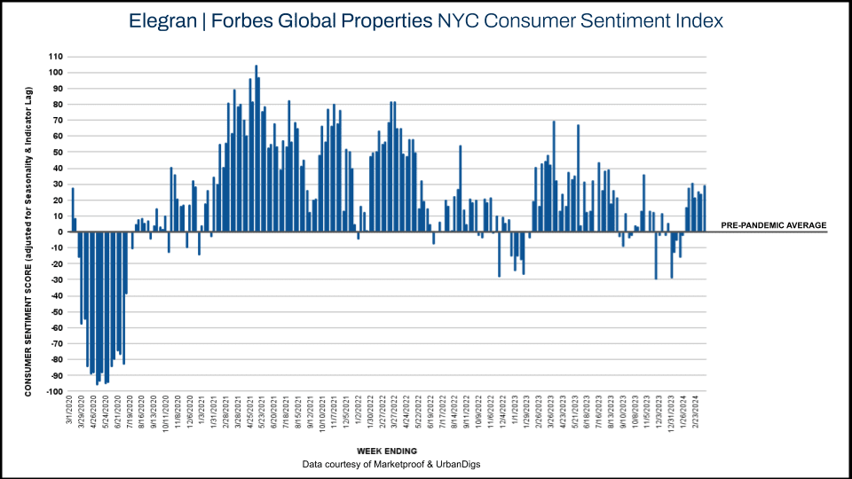 Continued Strong Demand: The Elegran | Forbes Global Properties NYC Consumer Sentiment Index maintains a positive sentiment score of +29, indicating sustained consumer optimism. This sentiment is echoed in the weekly contract volumes, with Manhattan consistently maintaining contract volumes above 200 and Brooklyn witnessing an increase in contracts signed compared to the previous week.
