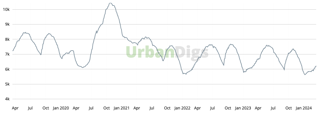 Once again, supply remains above the 6,000 level. This week, 444 new listings came to market, and supply increased by almost 2% to 6,238 units for sale. This marks the third week with more than 400 new-to-market listings since last September.