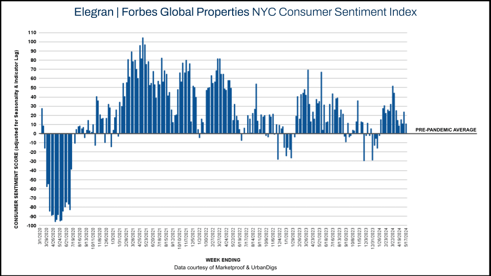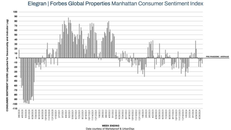 This week, Manhattan’s score on the Elegran | Forbes Global Properties Manhattan Consumer Sentiment Index decreased from -6 to -13, as 218 contracts were signed, a 6% decrease from last week. The Sentiment Index continues to be in negative territory for the sixth week as contract activity in the borough is comparably light for the spring season.