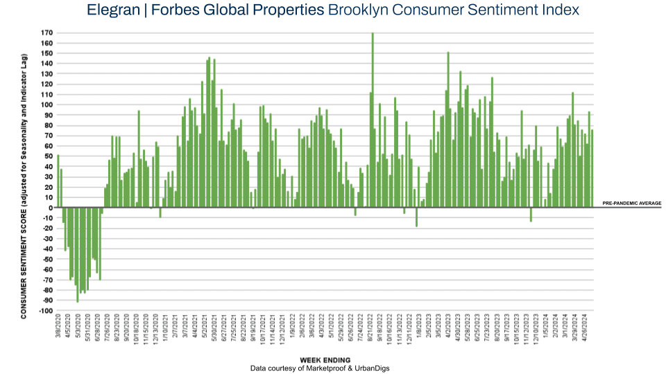 This week, Brooklyn’s score on the Elegran | Forbes Global Properties Brooklyn Consumer Sentiment Index decreased from +94 to +76 as 145 contracts were signed, a 9% decrease from last week.